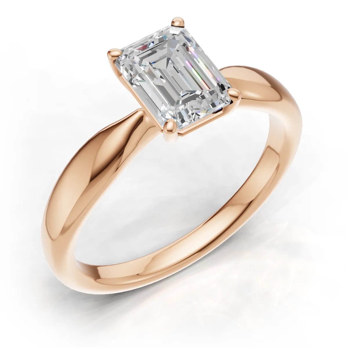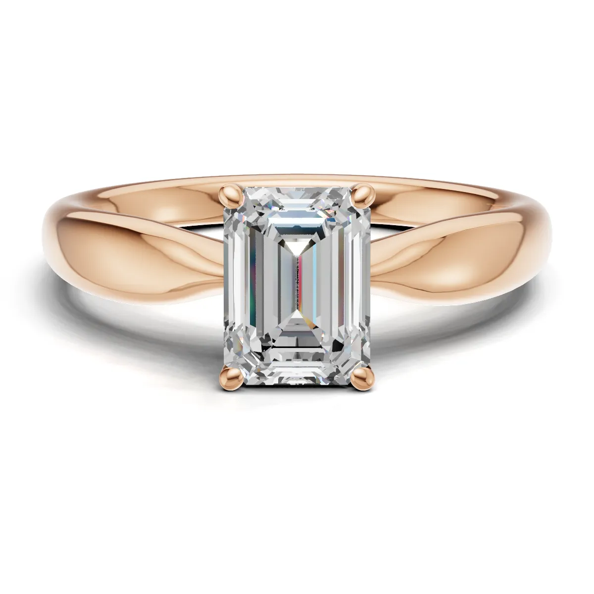 Das Ringband steigt fließend zur Fassung an und verleiht dem Design eine sanfte Dynamik. Durch die gewölbte Form entsteht ein harmonischer Übergang zum rechteckigen Emerald Cut, der in einer offenen Krone gehalten wird. Die klaren Kanten des Diamanten stehen im Kontrast zur weichen Linienführung des Rings – präzise ausbalanciert und konsequent modern.