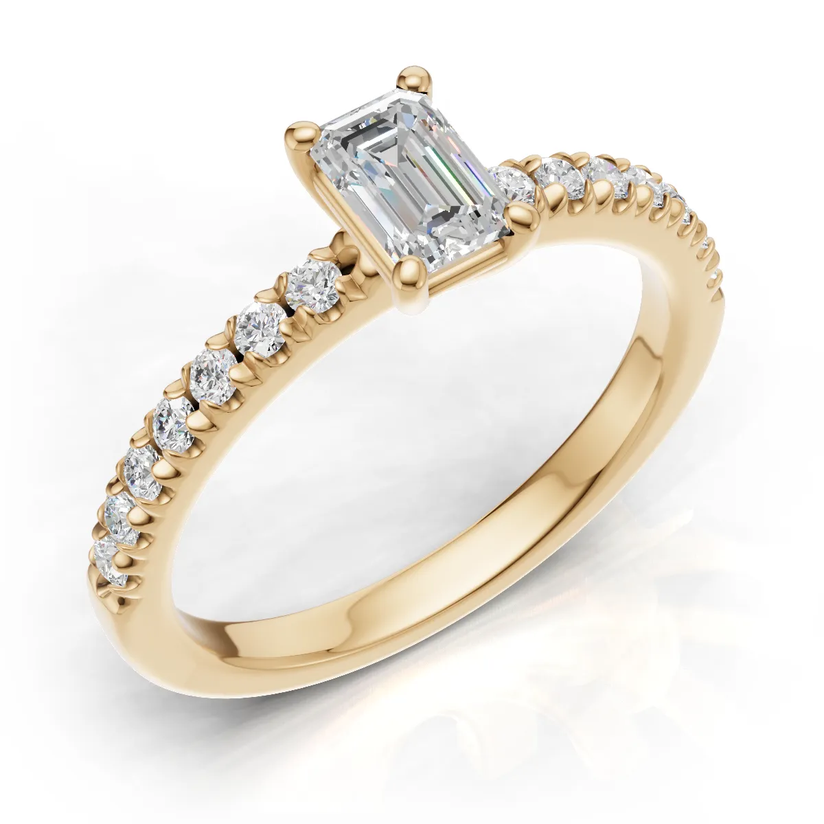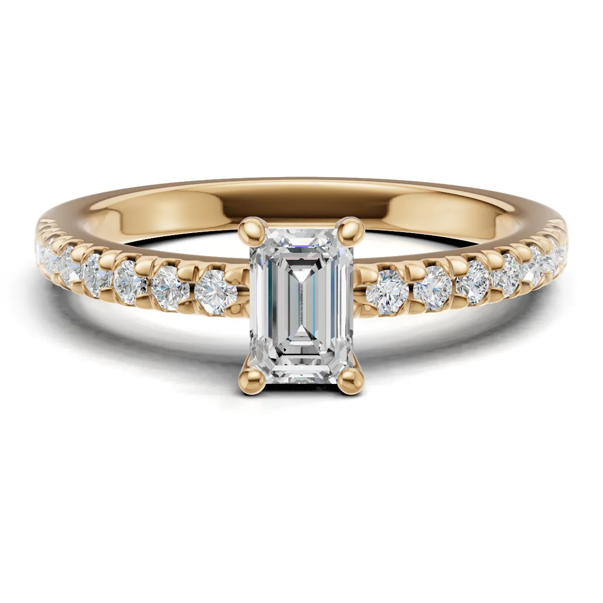 Ein Design mit klarer Linie und kontrollierter Spannung. Der Emerald Cut sitzt erhöht in einer offenen Krone, die seine länglichen Facetten präzise betont. Entlang der Ringschiene fassen feine Pavé-Diamanten das Licht ein und führen den Blick zum Zentrum. Ein Solitär mit architektonischer Ruhe und ausgewogener Strahlkraft.