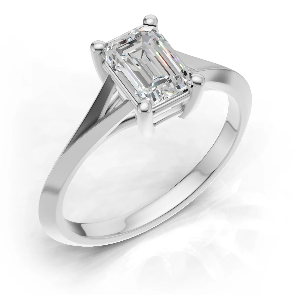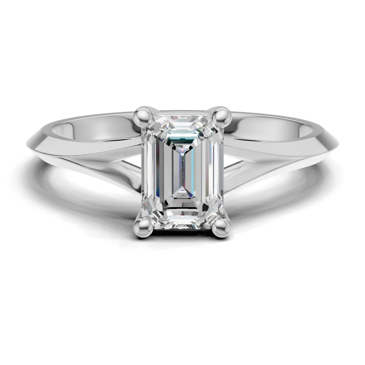 Dieser Solitär-Ring wurde für den eleganten Emerald-Cut entworfen – ein Schliff, der für klare Linien und eine edle, ruhige Brillanz steht. Der rechteckige Diamant sitzt in einer feinen Korbfassung, die ihn dezent anhebt und das Licht von allen Seiten einfallen lässt.