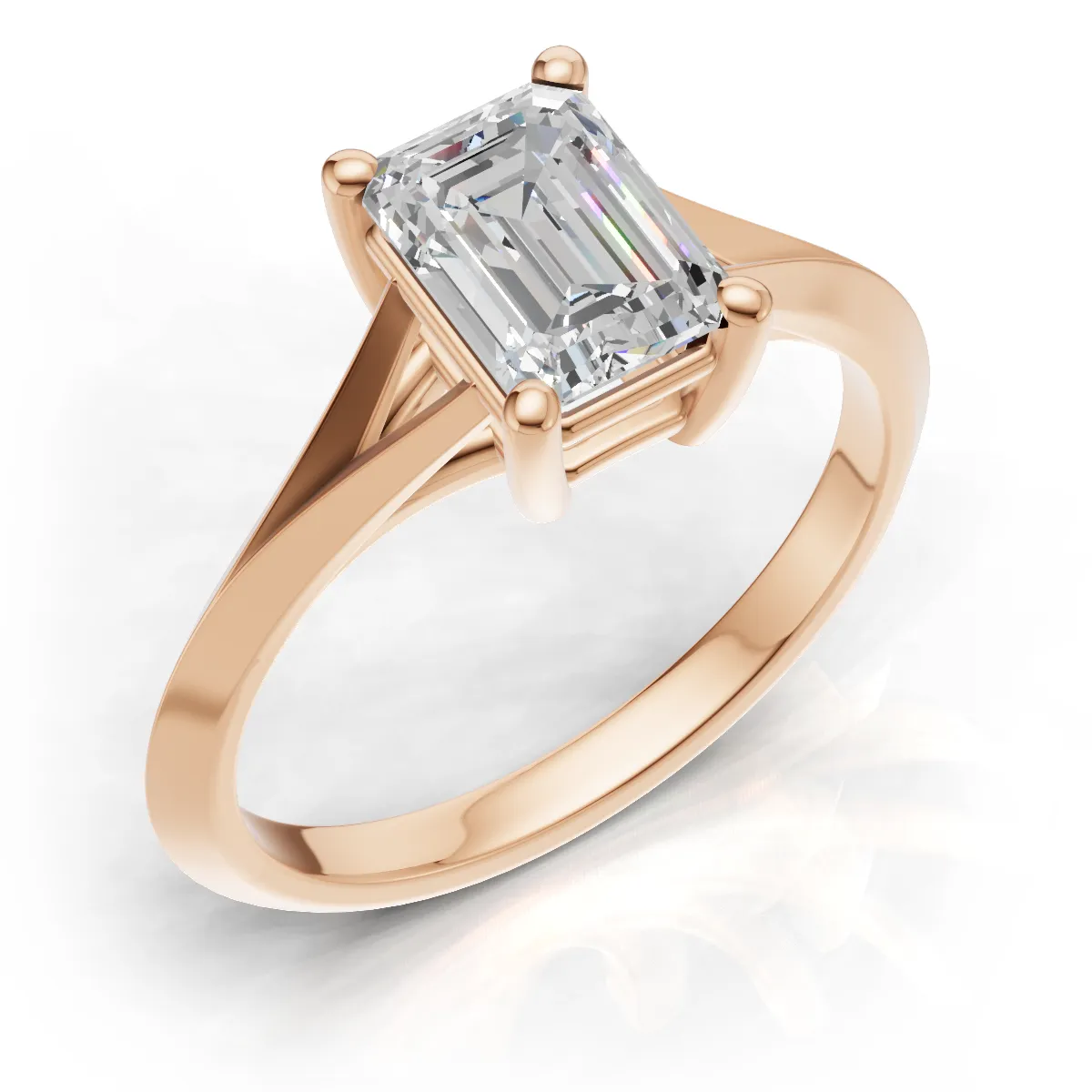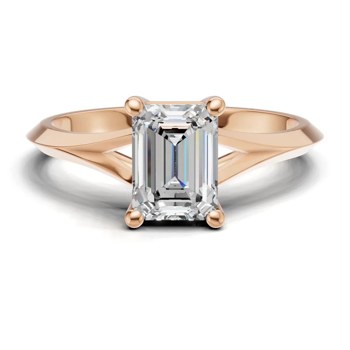 Dieser Solitär-Ring wurde für den eleganten Emerald-Cut entworfen – ein Schliff, der für klare Linien und eine edle, ruhige Brillanz steht. Der rechteckige Diamant sitzt in einer feinen Korbfassung, die ihn dezent anhebt und das Licht von allen Seiten einfallen lässt.