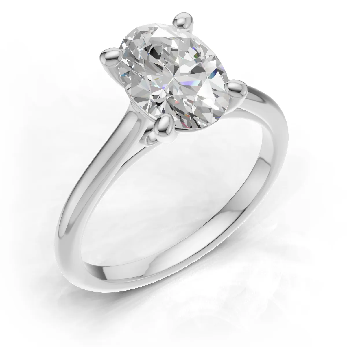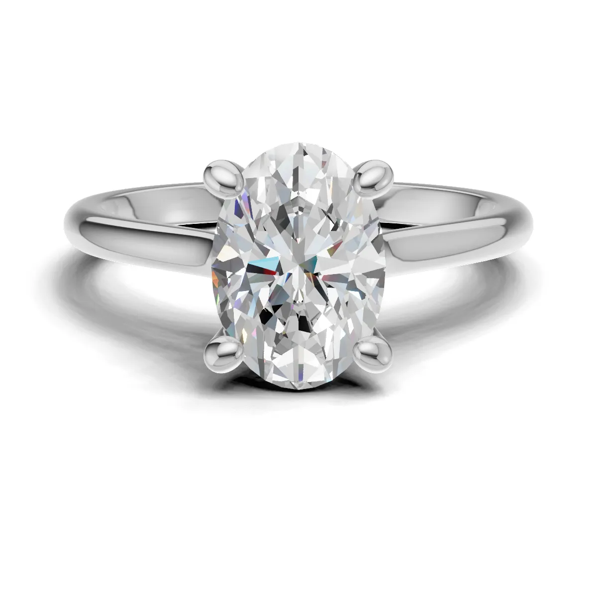 Ein moderner Solitär, reduziert auf das Wesentliche. Der ovale Diamant sitzt erhöht und wird von einer eleganten Krone gehalten, die das Licht aus allen Winkeln einfängt. Die Linienführung ist bewusst schlank — weich zulaufend und mit fließender Silhouette. Unter dem Stein: ein feines Infinity-Element. Dezent integriert, als stilles Symbol für Beständigkeit und Verbundenheit.