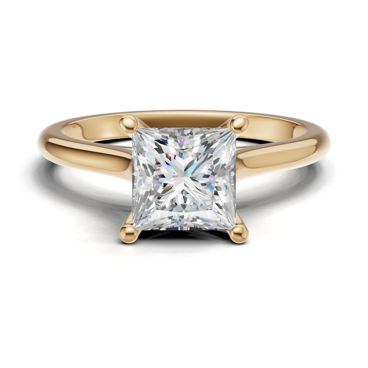 Ein klarer Entwurf mit feiner Spannung. Der Princess Cut sitzt erhöht in einer offenen Krone, die Licht ungehindert durchlässt und die scharfen Facetten präzise betont. Die Ringschiene verjüngt sich sanft zur Fassung hin und ist harmonisch proportioniert und angenehm ausbalanciert. Ein Solitär, der moderne Eleganz definiert.
