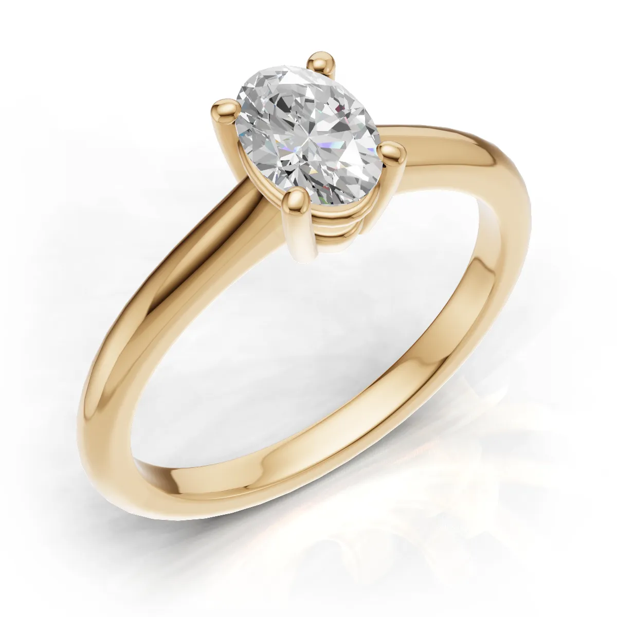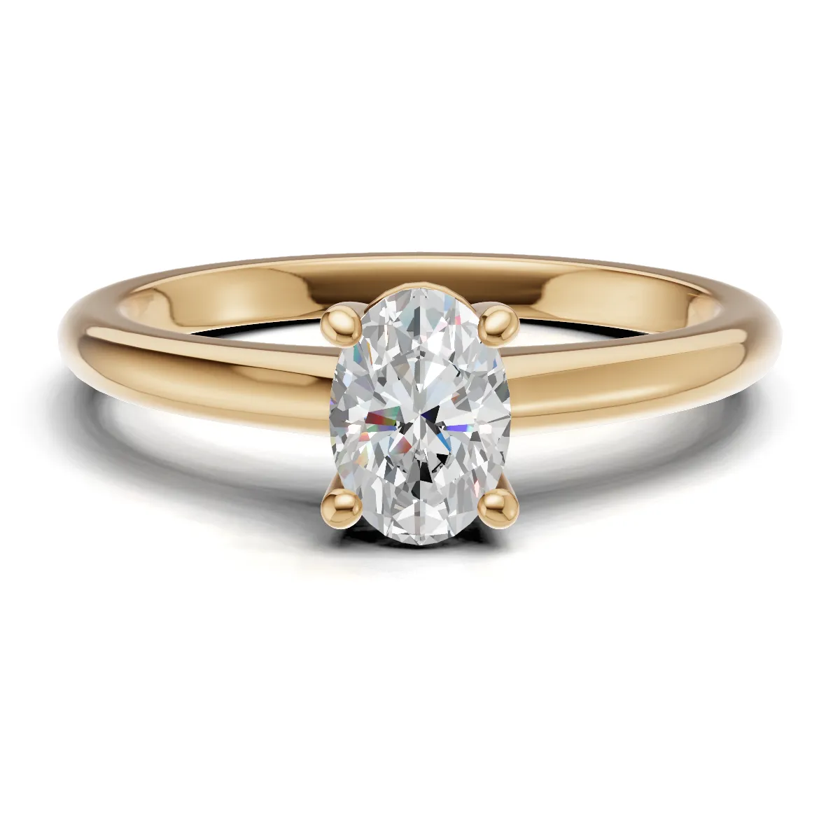 Dieser klassische Solitär-Ring wurde speziell für einen Oval-Cut-Diamanten entworfen und besticht durch seine ausgewogene, zeitlose Form. Vier schlichte Krappen halten den Mittelstein sicher in einem fein gearbeiteten Korb, der den Diamanten leicht erhöht und optimal ins Licht setzt. Das Ringband verläuft nach oben hin sanft ansteigend und fügt sich harmonisch in die Fassung ein – ein feines Detail, das dem Design eine fließende, elegante Linie verleiht.